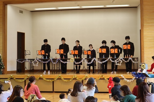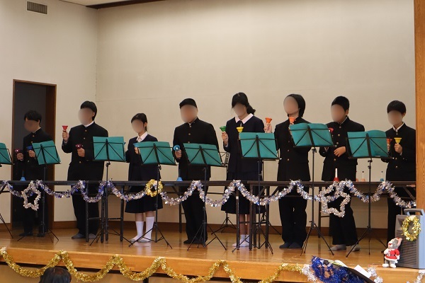 12月16日(火)に、9組生徒が南箇公民館の子育てサロンクリスマス会でハンドベルの演奏を行いました。生徒は2グループに分かれて、「きよしこの夜」と「星に願いを」を演奏しました。また、アコーディオン奏者のゲストの方とも一緒に演奏することができ、とても貴重な経験になりました。